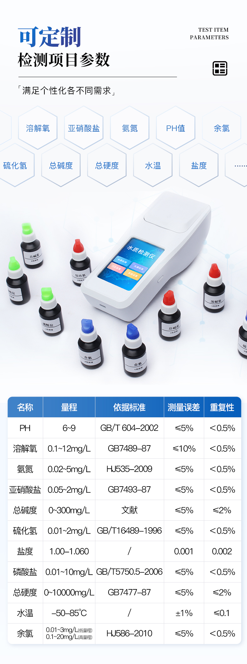 適用于純凈水廠、自來(lái)水廠、生活污水處理廠、工業(yè)污水、水產(chǎn)養(yǎng)殖、河流監(jiān)測(cè)、游泳場(chǎng)館、水源保護(hù)、生產(chǎn)監(jiān)測(cè)、科研實(shí)驗(yàn)等。