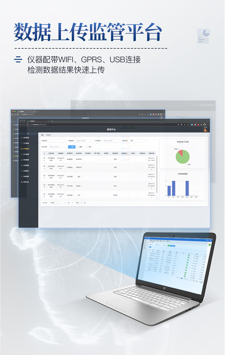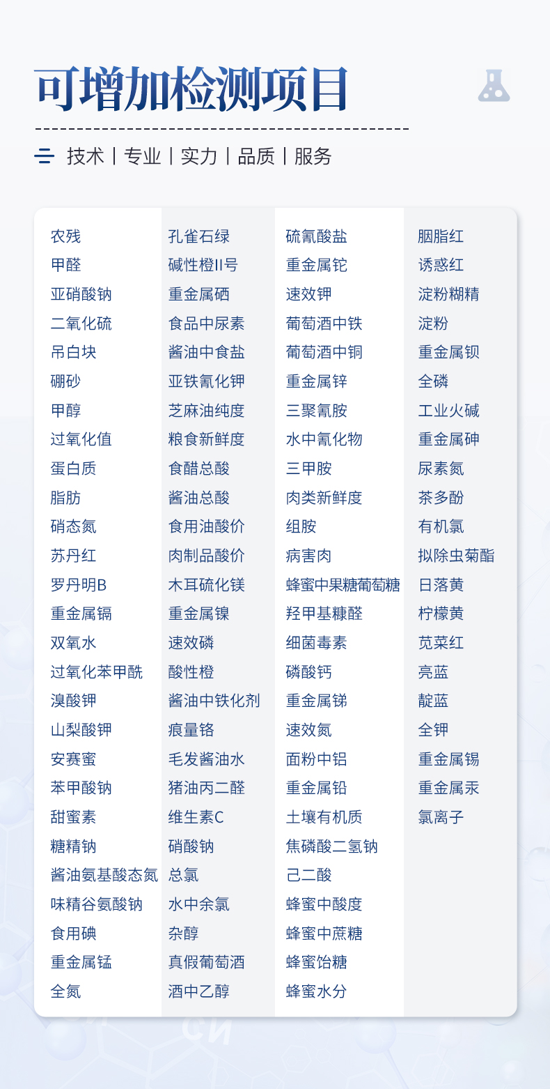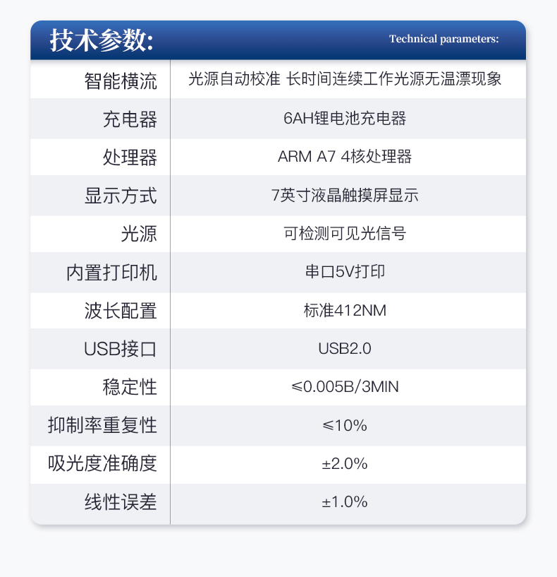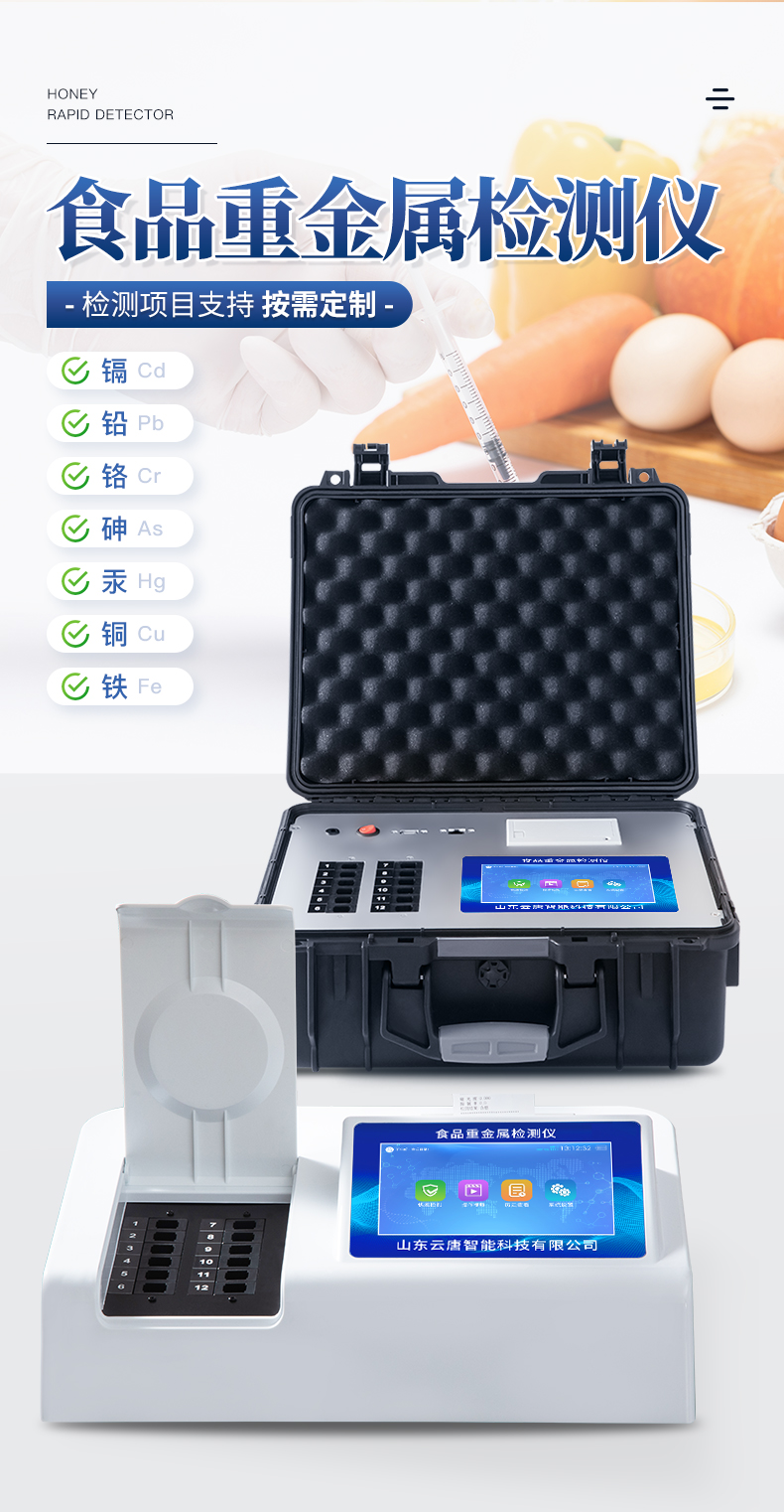 儀器采用臺(tái)式一體化系統(tǒng)檢測(cè)技術(shù),將分光光度模塊、數(shù)字化管理模塊、無(wú)線通訊模塊高度集成于一體,可支持檢測(cè)60種食品安全檢測(cè)項(xiàng)目,同時(shí)預(yù)留升級(jí)檢測(cè)方法。儀器檢測(cè)模塊標(biāo)準(zhǔn)化、智能化,檢測(cè)項(xiàng)目可隨意自由組合。檢測(cè)箱體內(nèi)置多個(gè)標(biāo)準(zhǔn)檢測(cè)單元,檢測(cè)模塊可以調(diào)整配置。儀器采用全新安卓智能系統(tǒng),主控芯片采用 ARM Cortex-A7,RK3288/4核處理器,10.1寸高清液晶觸摸豎屏,更加**的UI交互界面,運(yùn)轉(zhuǎn)快捷;儀器配備無(wú)線通信模塊: 4G(APN)通訊模塊、Wifi模塊,藍(lán)牙傳輸,同時(shí)具有雙USB接口以及RJ45接口能以多種方式實(shí)現(xiàn)數(shù)據(jù)保存和數(shù)據(jù)傳輸功能。顯示屏幕:儀器采用10.1英寸豎向液晶觸摸屏顯,搭配運(yùn)行安卓智能操作系統(tǒng),主控芯片采用ARM Cortex-A7,RK3288/4核處理器,主頻1.88Ghz,操作方便,性能更強(qiáng)。檢測(cè)通道:≥12通道;采用精密旋轉(zhuǎn)比色池設(shè)計(jì),使用同芯片同光源校準(zhǔn)精度,解決不同光源之間的誤差值,更加準(zhǔn)確**。(1-12通道間誤差0.1%,**號(hào):**202022821055.2)儀器光源:高精度進(jìn)口四波長(zhǎng)冷光源,每個(gè)通道均配置 410、520、590、630nm 波長(zhǎng)光源,標(biāo)配**的光路切換裝置,**光路切換功能可實(shí)現(xiàn)64波長(zhǎng),并且所有檢測(cè)項(xiàng)目可實(shí)現(xiàn)所有通道同時(shí)檢測(cè)。設(shè)備可一鍵校準(zhǔn),自動(dòng)保存校準(zhǔn)數(shù)據(jù),自動(dòng)對(duì)比校驗(yàn),得到精準(zhǔn)光源,采用Android SP存儲(chǔ)數(shù)據(jù),光源數(shù)據(jù)永不丟失,方便每一次使用。通訊接口:配備無(wú)線通信模塊、4G(APN)通訊模塊、藍(lán)牙傳輸,同時(shí)具有雙USB接口以及RJ45網(wǎng)線接口,可以多方式實(shí)現(xiàn)數(shù)據(jù)保存及數(shù)據(jù)傳輸。存儲(chǔ)方式:支持U盤存儲(chǔ),標(biāo)準(zhǔn)USB接口,免驅(qū)動(dòng)安裝。檢測(cè)結(jié)果存儲(chǔ)容量20萬(wàn)條以上,可生成Excel表格進(jìn)行拷貝,并具有登錄保護(hù)功能。智能化操作系統(tǒng):1、操作系統(tǒng):儀器可在同一檢測(cè)界面自動(dòng)對(duì)應(yīng)相關(guān)檢測(cè)通道,一次性選擇1-12個(gè)樣品名稱,無(wú)需退出界面,節(jié)省操作時(shí)間。并可以對(duì)每個(gè)通道屬性和樣品信息單獨(dú)進(jìn)行編輯,例如送檢單位、人員,檢測(cè)人員等,打印時(shí)勾選打印顯示。2、數(shù)據(jù)集成系統(tǒng):設(shè)備首頁(yè)自動(dòng)匯總分析檢測(cè)數(shù)據(jù),包含:周檢測(cè)數(shù)據(jù)、月檢測(cè)數(shù)據(jù),全部檢測(cè)總數(shù)量,均包含檢測(cè)總數(shù),合格數(shù),不合格數(shù),以及相關(guān)柱形分析圖,各項(xiàng)檢測(cè)數(shù)據(jù)一目了然,無(wú)需電腦查詢,更加快捷直觀。3、數(shù)據(jù)庫(kù)系統(tǒng):十幾項(xiàng)數(shù)據(jù)庫(kù)分類管理儀器:包含項(xiàng)目類型、項(xiàng)目數(shù)據(jù)、檢測(cè)數(shù)據(jù)、歷史記錄、國(guó)標(biāo)信息、曲線信息、采樣信息、檢測(cè)信息、受檢信息、復(fù)核信息、圖表信息、光源校準(zhǔn)信息、打印樣式信息、樣品庫(kù)信息等等,數(shù)據(jù)庫(kù)之間互相協(xié)調(diào)聯(lián)動(dòng)保證數(shù)據(jù)的真實(shí)完整性。同時(shí)產(chǎn)品數(shù)據(jù)庫(kù)以及歷史檢測(cè)記錄支持一鍵檢索功能。4、限量規(guī)判系統(tǒng):具有限量查詢、添加物質(zhì)合規(guī)判定系統(tǒng)。檢測(cè)出結(jié)果后,系統(tǒng)自動(dòng)調(diào)用系統(tǒng)數(shù)據(jù)庫(kù)中相關(guān)國(guó)標(biāo)進(jìn)行比對(duì)判定,客觀顯示判定結(jié)果是否合格。5、項(xiàng)目預(yù)設(shè)系統(tǒng):儀器具有任務(wù)預(yù)設(shè)模塊,一鍵提前預(yù)設(shè),給出方便快捷的新檢測(cè)方案,每一個(gè)任務(wù)分別可以設(shè)置不同的樣品、批次、編號(hào)、來(lái)源、備注、抽樣信息、檢測(cè)信息、受檢信息、復(fù)核信息等更多信息。樣品送檢時(shí)一鍵調(diào)取保存信息,并可多次調(diào)取,大大提高檢測(cè)效率。6、數(shù)據(jù)監(jiān)管系統(tǒng):同步對(duì)接監(jiān)管平臺(tái),數(shù)據(jù)可局域網(wǎng)和互聯(lián)網(wǎng)數(shù)據(jù)上傳,檢測(cè)結(jié)果可選擇直接傳至食品安全監(jiān)管平臺(tái)。進(jìn)行區(qū)域食品安全監(jiān)管及大數(shù)據(jù)分析處理與數(shù)據(jù)統(tǒng)計(jì),檢測(cè)區(qū)域食品安全長(zhǎng)短期動(dòng)態(tài),達(dá)到食品安全問(wèn)題預(yù)估、預(yù)警。7、全新打印系統(tǒng):內(nèi)置全新打印機(jī),新創(chuàng)自定義打印方式,可按需靈活勾選控制:二維碼,抽樣信息、檢測(cè)信息,受檢信息、復(fù)核信息、抽樣日期、檢測(cè)日期等信息的打印。8、A4紙版本報(bào)告打印功能(可選配):設(shè)備擁有兩種結(jié)果展示方式,可以自動(dòng)生成A4打印模板和小票打印模板兩種樣式,可通過(guò)WiFi及網(wǎng)線等方式鏈接外置打印機(jī)可進(jìn)行打印。供電模式:儀器交直流兩用,直流12V供電,可連接車載電源,可配6ah大容量充電鋰電池,電量可實(shí)時(shí)顯示,方便戶外流動(dòng)測(cè)試。儀器具備遠(yuǎn)程升級(jí)功