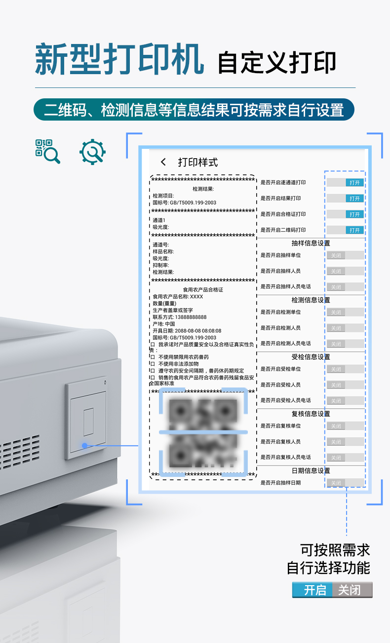 9.7.1、全新打印系統:內置全新打印機,新創自定義打印方式,可按需靈活勾選控制:二維碼,抽樣信息、檢測信息,受檢信息、復核信息、抽樣日期、檢測日期等信息的打印。