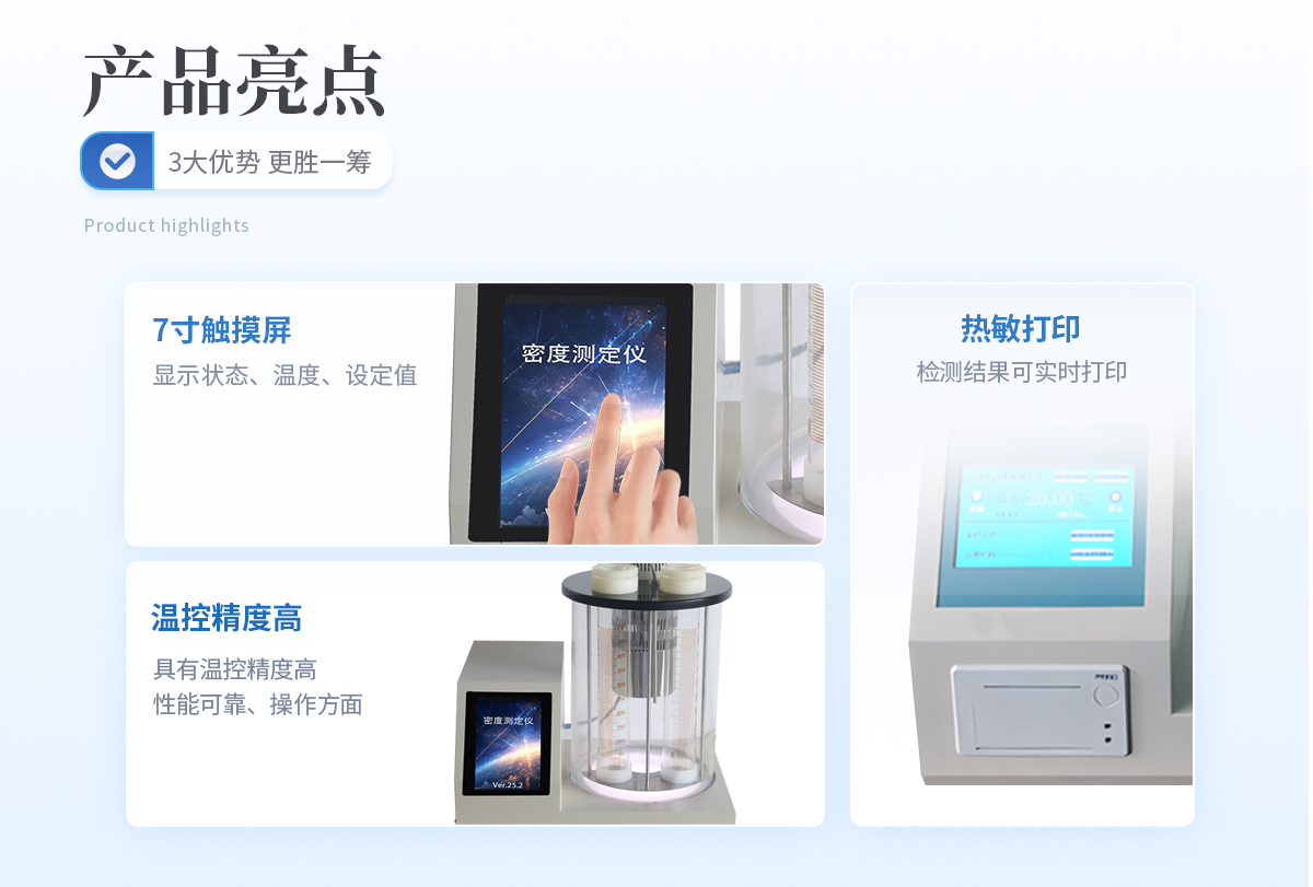 簡介:儀器特點:石油密度自動測定儀,符合GB/T 1884-2000方法要求。儀器采用了高性能微處理器,彩色觸摸液晶顯示器及PID自整定控制技術,使儀器具有溫控精度高,性能可靠、操作方面等優點,是石油、電力、化工等行業替代進口產品的專用儀器。工作原理:該儀器按照GB/T 1884-2000方法要求,由CPU控制加熱器、制冷器對水浴進行控溫,