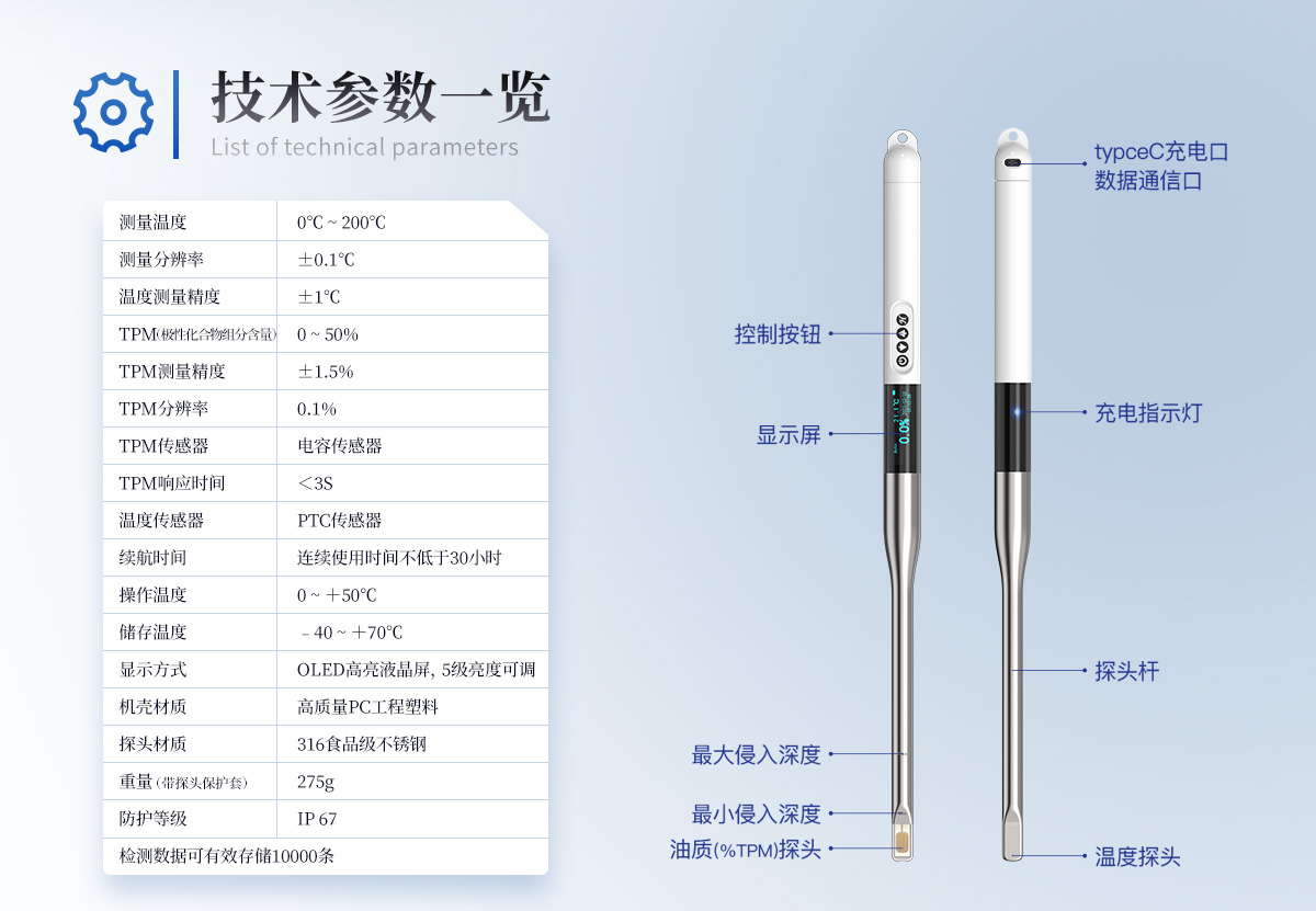 食用油脂是人們攝取能量和營養(yǎng)的重要來源,是加工食品的重要原料。油炸食品以其特有風(fēng)味廣受消費(fèi)者喜歡。用于煎炸的食用油在高溫煎炸過程中發(fā)生一系列的物理、化學(xué)變化,這些變化會(huì)生成對(duì)身體健康有害的物質(zhì)。目前,煎炸食用油的傳統(tǒng)檢測方法多為化學(xué)方法,這些方法必須在實(shí)驗(yàn)室內(nèi)由專業(yè)人員操作,費(fèi)時(shí)費(fèi)力,化學(xué)試劑的使用可能會(huì)傷害檢測人員健康,且化學(xué)廢劑污染了環(huán)境。YT-SYP是一種快速,安全,**食用油品質(zhì)檢測儀,能夠快速檢測食用油中的極性化合物組分(TPM)含量。本產(chǎn)品能夠在油溫較高的環(huán)境下使用,適用于各種煎炸的食用油品質(zhì)檢驗(yàn)。