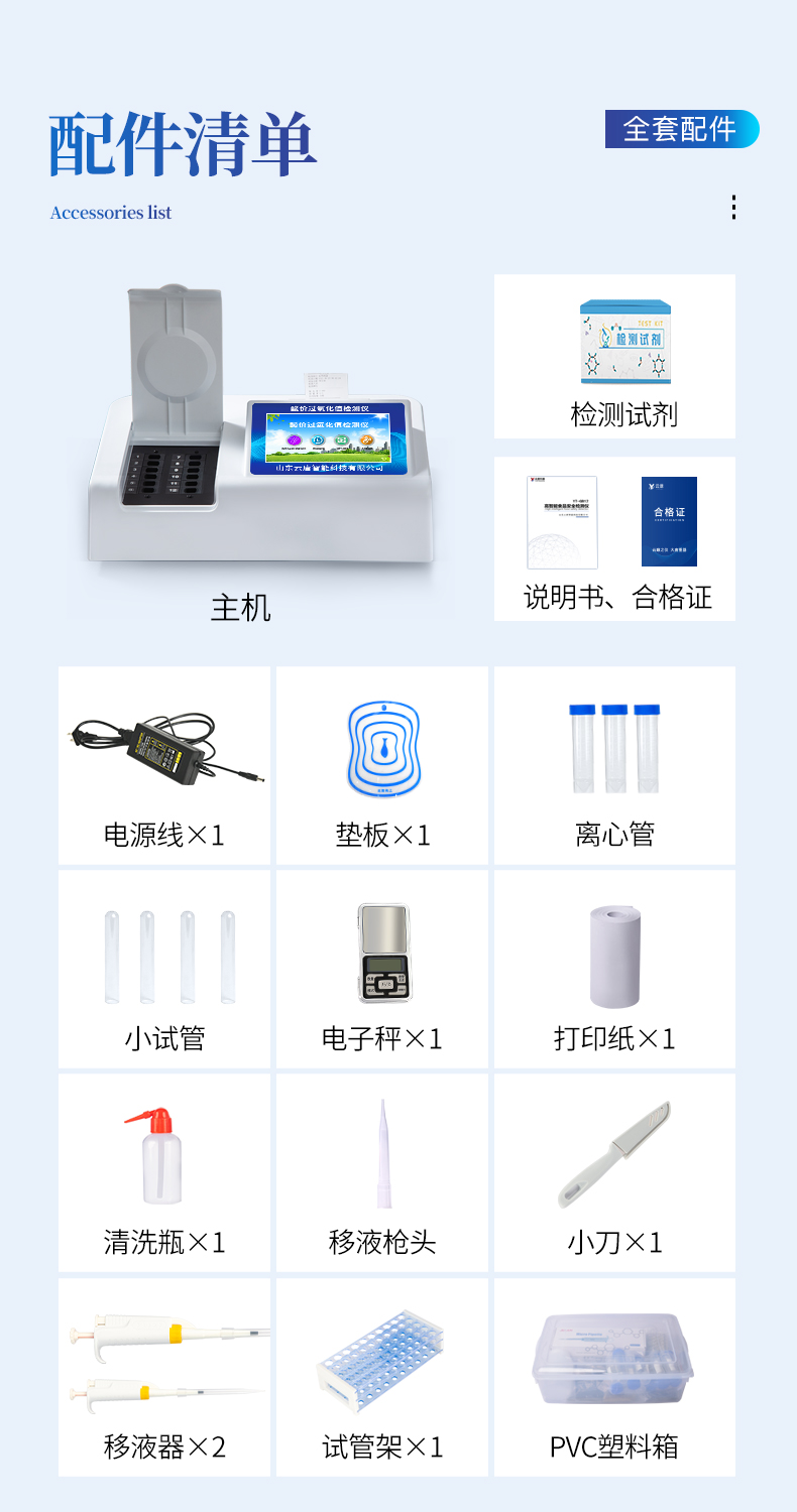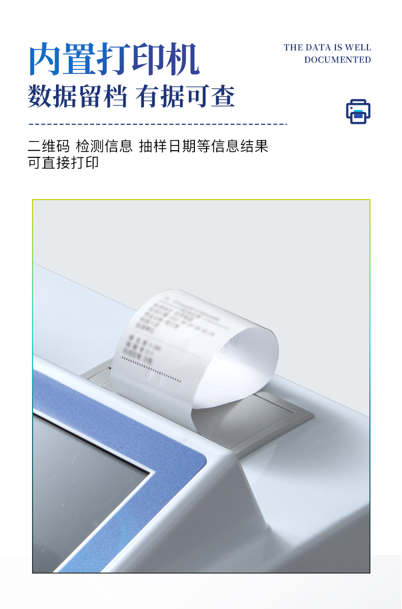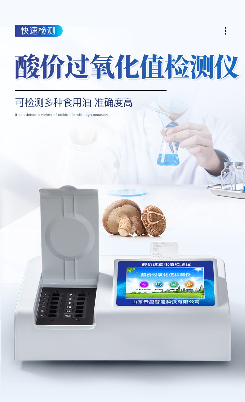 安卓智能操作系統,采用更加**和人性化操作,儀器具有網線連接、wifi聯網上傳、GPRS無線遠傳功能,快速上傳數據。一體化便攜式快檢設備,滿足現場及流動檢測使用需求,能夠在同一軟件下實現所有檢測項目的檢測,并可通過同一窗口直觀顯示檢測結果。智能化程度高,儀器具有自檢功能:具有開機自檢和調零功能,具有自動檢測重復性功能。檢測通道:≥12個檢測通道,可以同時測試多個樣品,每個樣品由程序控制分別獨立工作,不會互相干擾。顯示方式:≥8英寸液晶觸摸屏顯示,人性化中文操作界面,讀數直觀、簡單。配備新一代嵌入式熱敏打印機,可選擇手動打印或者自動打印,檢測完成可自動打印檢測報告和二維碼。光源采用進口超高亮發光二極管,高精度、穩定性強、光源可控、可以關掉不使用的光源,功耗更低。采用USB2.0接口設計,方便數據的存貯和移動,并可隨時與計算機直接相連,并且可用計算機控制儀器。實現數據查詢、瀏覽、分析、統計、打印等。儀器具有品類多種類樣品菜單庫,可靈活選擇檢測樣品,不同的檢測通道可同時檢測不同的樣品項目。樣品處理簡單省力,整體操作快速、安全、便捷。儀器具有自身保護功能,可設置用戶名及密碼,防止非工作人員操作等。高靈敏度,高檢測精度,高重復性精度,掃描式高精度光學傳感器。過氧化值檢測儀器具有重新校準、鎖定、恢復出廠設置功能。結果判定線可修改,對照值標定值可保存,斷電不丟失數據。