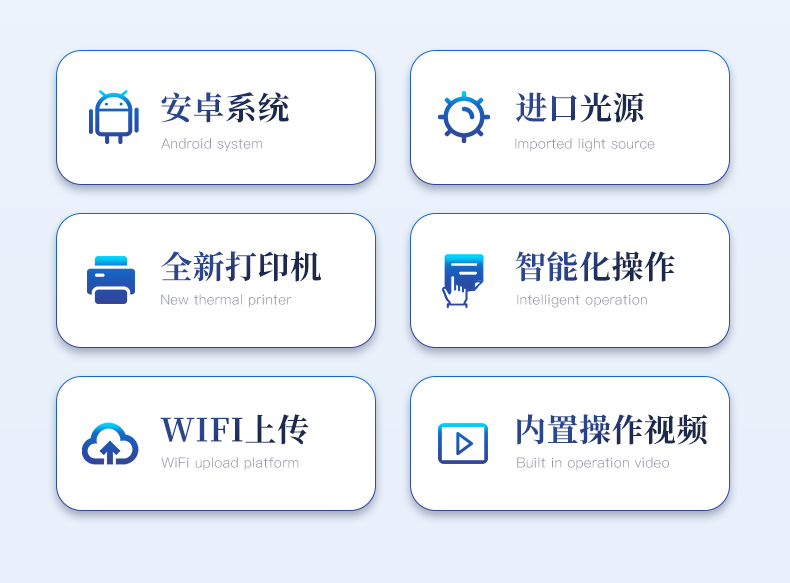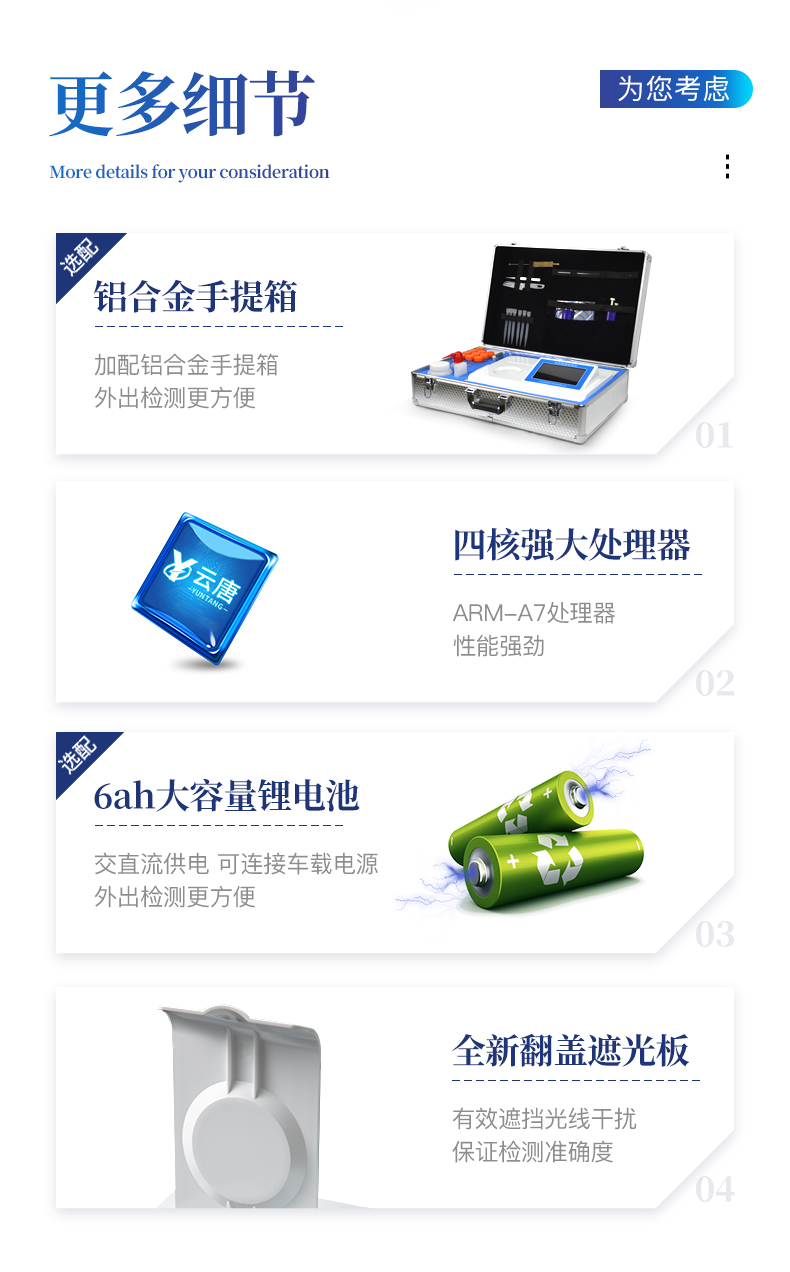 主控芯片采用ARM Cortex-A7,RK3288/4核處理器,主頻1.88Ghz,運轉速度更快速,穩定性更強。顯示方式:7英寸液晶觸摸屏顯示,人性化中文操作界面,讀數直觀、簡單。直流12V供電,可連接車載電源,可配6ah大容量充電鋰電池,方便戶外流動測試。雙波長冷光源,每個通道均配置405、528nm波長光源,標配**的光路切換裝置,**光路切換功能可實現*多64波長,并且所有檢測項目可實現所有通道同時檢測。光源亮度自動調節與校準智能恒流穩壓,光強自動校準,長時間連續工作光源無溫漂現象。內置新國家限量標準,與所測結果進行現場比對,并持續更新標準。不間斷進樣,連續檢測樣本編號自動累加檢測項目可擴充。檢測結果可批量打印,批量上傳。檢測結果為Excel表格,連接電腦即可拷貝。支持U盤存儲,標準USB接口,免驅動安裝。可配置大容量鋰電池,固件可升級