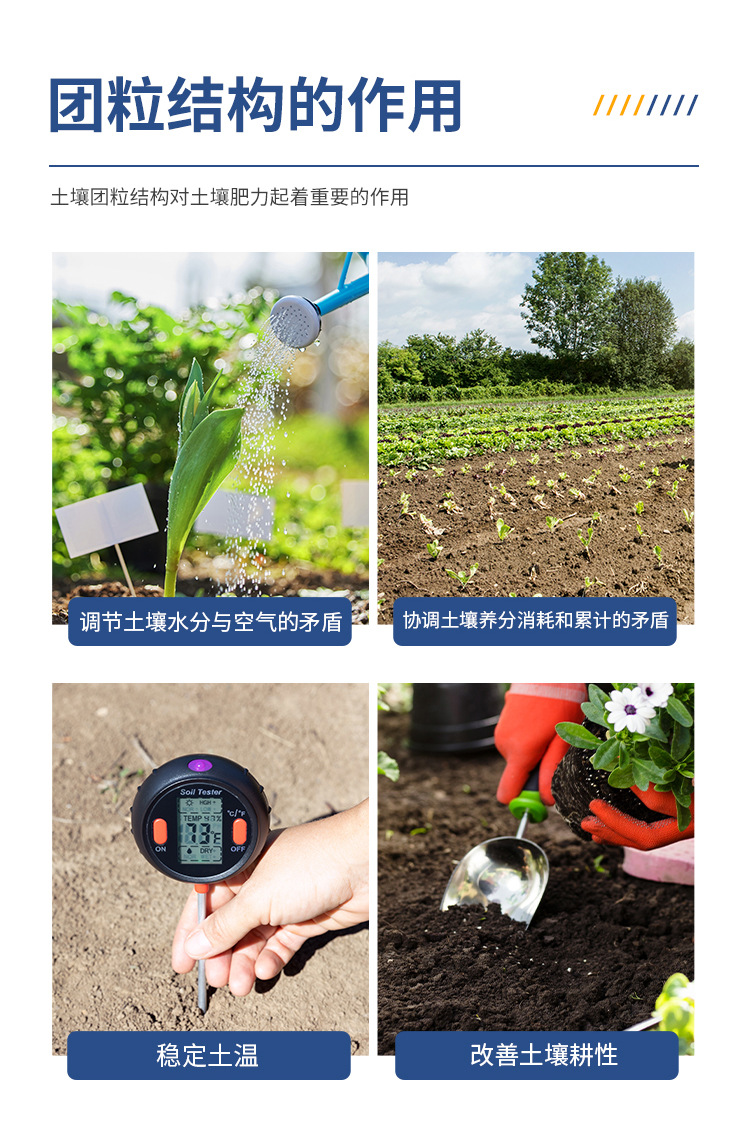 土 壤團粒結構對土壤肥力起著重要作用。良好的團粒結構體一般應具備三方面的性質:具有一定的大小,過大或過小都對形成適當的孔隙比例不利;具有多級孔隙,大 孔隙可通氣透水,小孔隙保水保肥;具有一定的穩定性,即水穩性、機械穩性和生物學穩定性。良好的團粒結構性是土壤肥力的基礎,團粒結構與土壤肥力的關系主 要表現在以下幾個方面:調節土壤水分與空氣的矛盾;協調土壤養分的消耗和積累的矛盾;穩定土溫,調節土壤熱狀況;改善土壤耕性,有利于作物根系伸展。