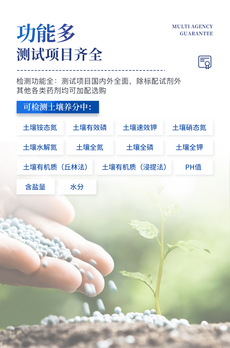 測試速度:正常熟練程度下,測一個土壤樣品(N、P、K)三項需要20分鐘(含藥劑準備及土樣前處理時間),同時檢測三個土壤樣品(N、P、K)≤40分鐘,同時測8個土樣≤1小時。