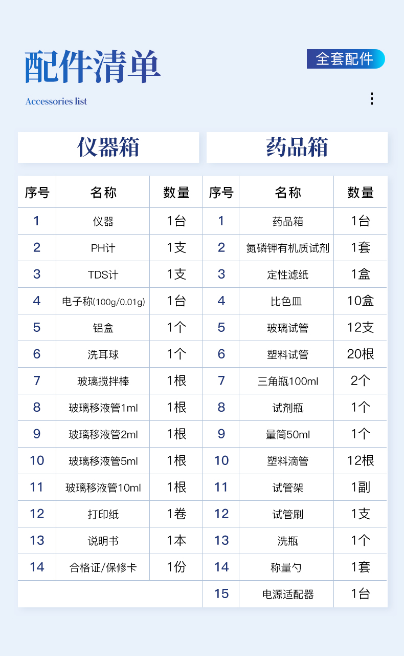 | 2 | PH計 | 1支 | 2 | 氮磷鉀有機質試劑 | 1套 |