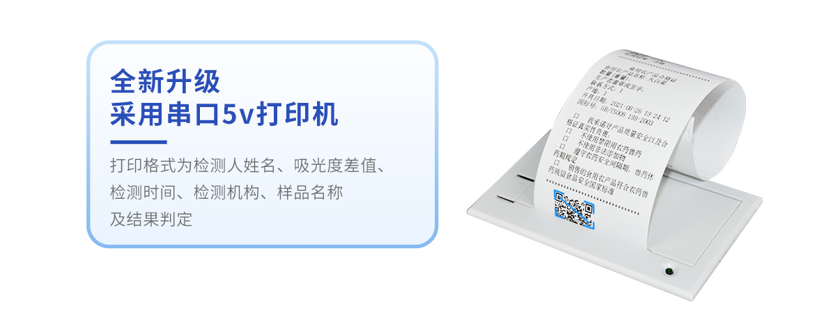 ①采用串口5v打印機,可選擇手動打印或者自動打印,三分鐘出打印結果,打印格式為檢測人姓名、吸光度差值、檢測時間、檢測機構、樣品名稱及結果判定。
