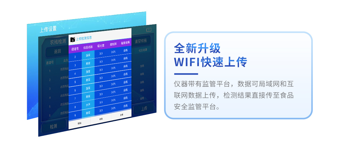 3、儀器帶有監管平臺,數據可局域網和互聯網數據上傳,檢測結果直接傳至食品安全監管平臺。進行區域食品安全監管及大數據分析處理與數據統計,檢測區域食品安全長短期動態,達到食品安全問題預估、預警 。