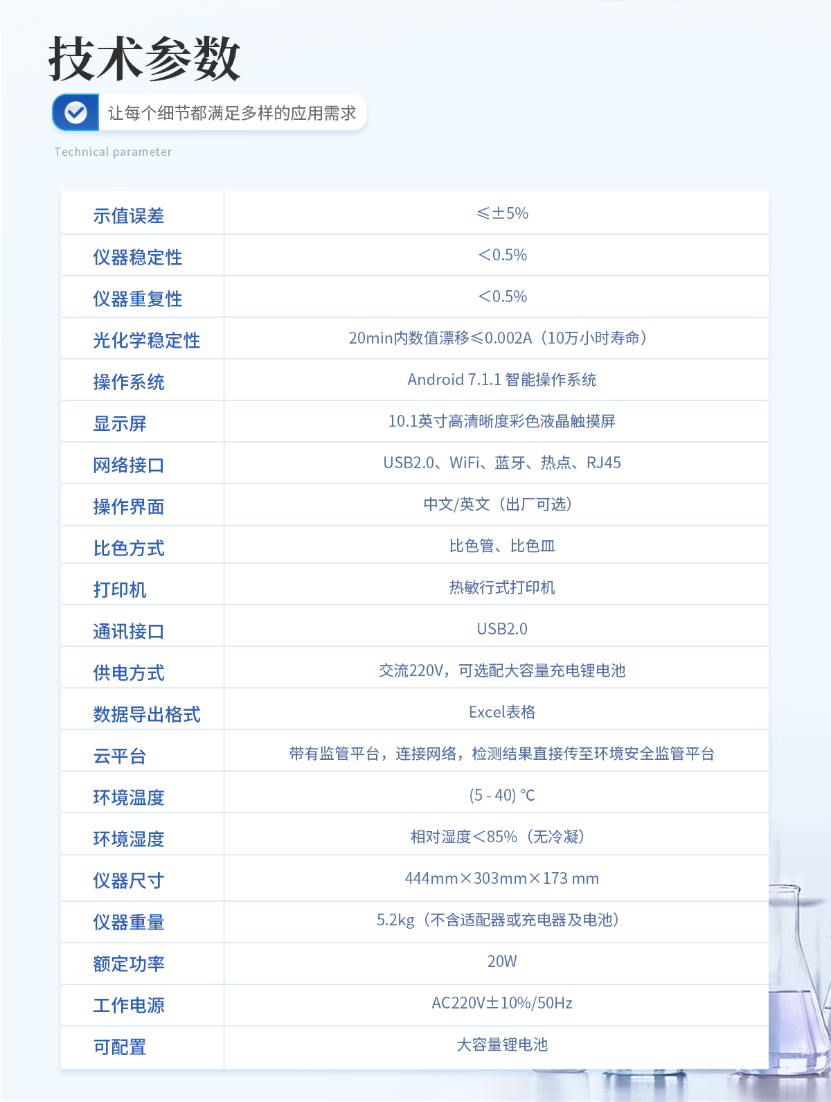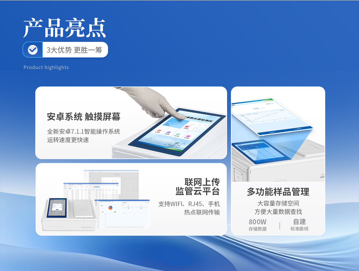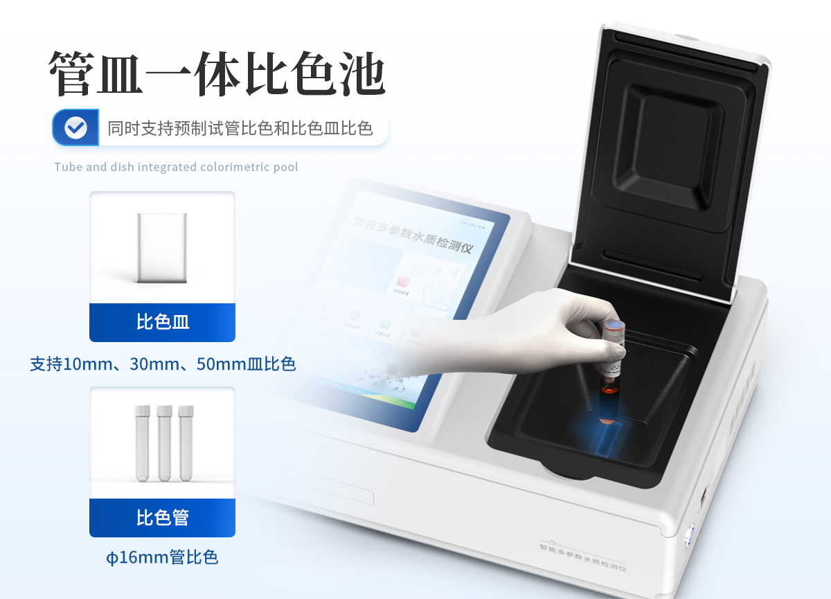 | 1、采用全新安卓7.1.1智能操作系統,人性化中文操作界面,運轉速度更快速,穩定性更強。 | 2、10.1英寸液晶觸摸屏顯示,人性化中文操作界面,讀數直觀、簡單。 | 3、采用精密比色池設計,使用光源一致,可以解決由于光源誤差帶來的檢測結果誤差問題,檢測結果更加精準。 | 4、光源采用進口超高亮發光二極管,光源亮度可以自動調節與校準。 | 5、支持10mm、30mm、40mm、50mm皿比色和φ16mm管比色等比色方式,多元選擇,確保測量的準確性; | 6、具有無線通訊功能,支持WIFI、RJ45、手機熱點聯網傳輸,檢測數據亦可通過U盤導出; | 7、多功能樣品管理,可對樣品進行中英文命名,方便樣品記錄和數據存儲; | 8、儀器可永久存儲800萬組數據,為方便大量數據查找,可通過時間檢索,并隨意選擇分析; | 9、支持HDMI輸出,方便用戶培訓、講解、及大屏展示。 | 10、儀器帶有監管云平臺,數據可通過局域網和互聯網上傳,亦可對接上傳至環境監管部門平臺。 | 11、內置熱敏行式打印機,打印紙上的內容可自由選擇(包括二維碼打印); | 12、交流220V,可選配6ah大容量充電鋰電池,方便戶外流動測試; | 13、內置教學演示視頻,用戶可一邊看儀器內操作視頻,一邊進行實驗操作,更易上手。 | 14、后期產品固件可升級。 |