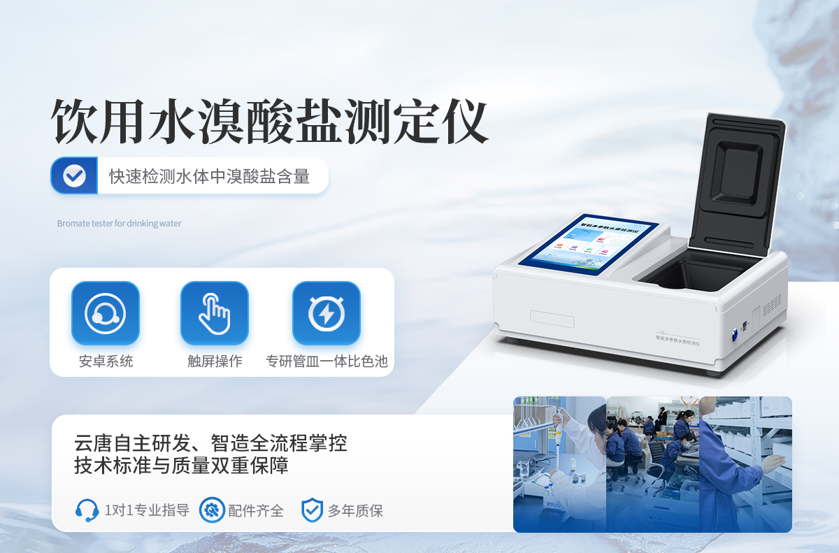 水質溴酸鹽快速檢測儀是一款檢測快速檢測水體中溴酸鹽含量的儀器,適用于經臭氧消毒后的礦泉水、凈化水、純凈水和各種包裝飲用水中溴酸鹽的定量檢測。