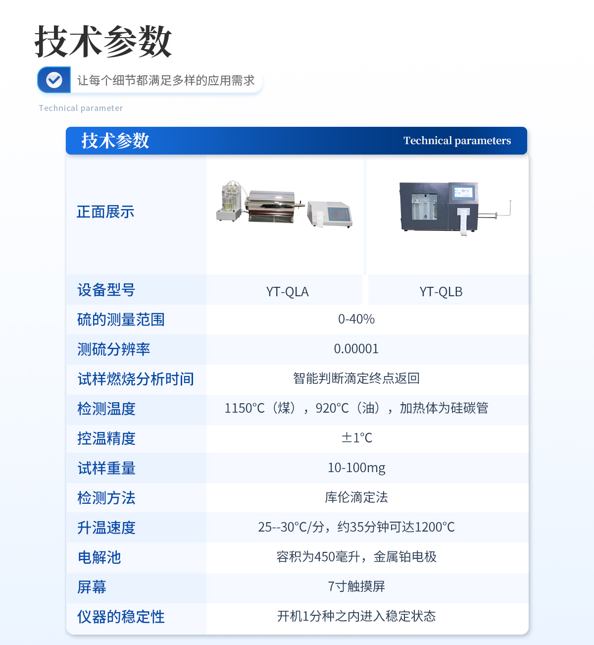 | 測硫范圍:0.01~100% | 測試方法:庫侖滴定法 | 測試分辨率:0.001% | 測試溫度:1150℃ | 升溫時間:≤25分鐘 | 分析時間:4min左右 | 測硫精度:符合國標 | 樣品數量:24個 | 工作爐溫:1150℃(煤、焦炭)、900℃(油) | 控溫精度:±2℃ | 試樣質量:50±5mg(煤、焦炭)、100±10mg(石油產品) | 送樣方式:自動送樣、棄樣 | 試樣數量:1-24個/批,試驗過程可添加/替換試樣 | 準確度:符合GB/T214-2007《煤中全硫的測定方法》 | 工作電源:AC220V±22V/50Hz 功率:≤2.5kW |
