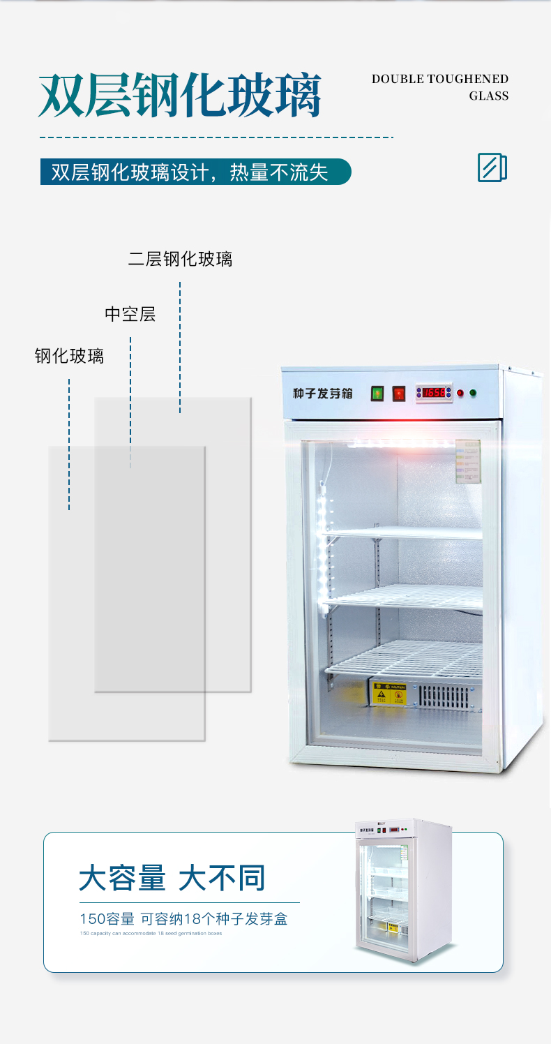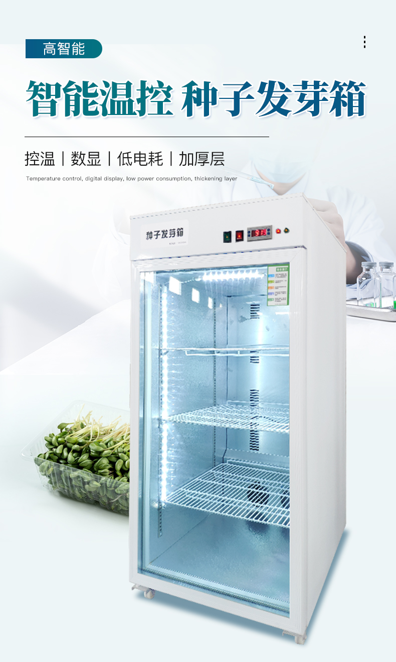 此箱可在不同地區(qū)不同季節(jié)使用不同的種子恒溫快速發(fā)芽,由于恒溫的作用,使種子的蛋白酶等化學(xué)物質(zhì)迅速分解反應(yīng),避免了溫差出芽造成的能量丟失,使種子出芽后抗病力強(qiáng),提高幼苗免疫能力,縮短了種子的出芽的時(shí)間。經(jīng)該器械出的幼芽,芽苗質(zhì)量好,成活率高。