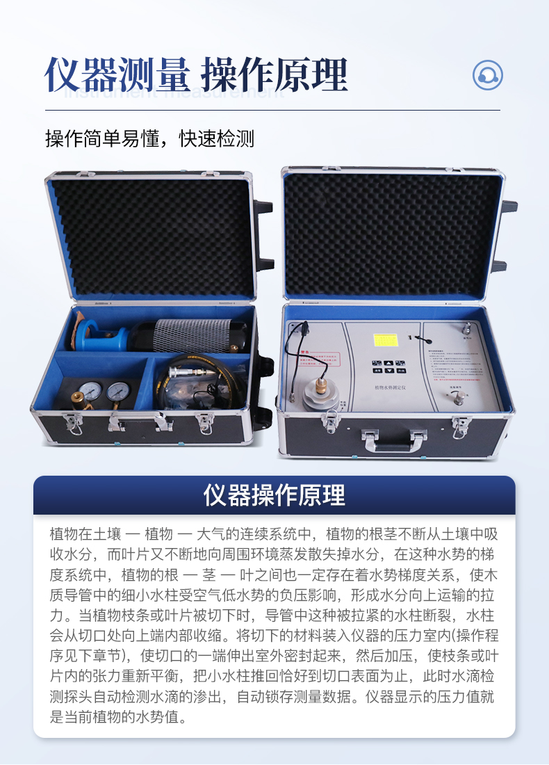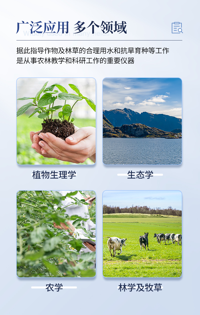 植物水勢儀是用于測定植物水份狀況和植物是否需要灌溉分析的一種儀器。可以利用此儀器研究植物的水分關系和植物與環境的關系。適用于植物生理學、生態學、農學、林學及牧草等的研究。據此指導作物及林草的合理用水和抗旱育種等工作,是從事農林教學和科研工作的重要儀器之一。它操作簡便,檢測快速,同時適用于室內和室外及野外測量。
