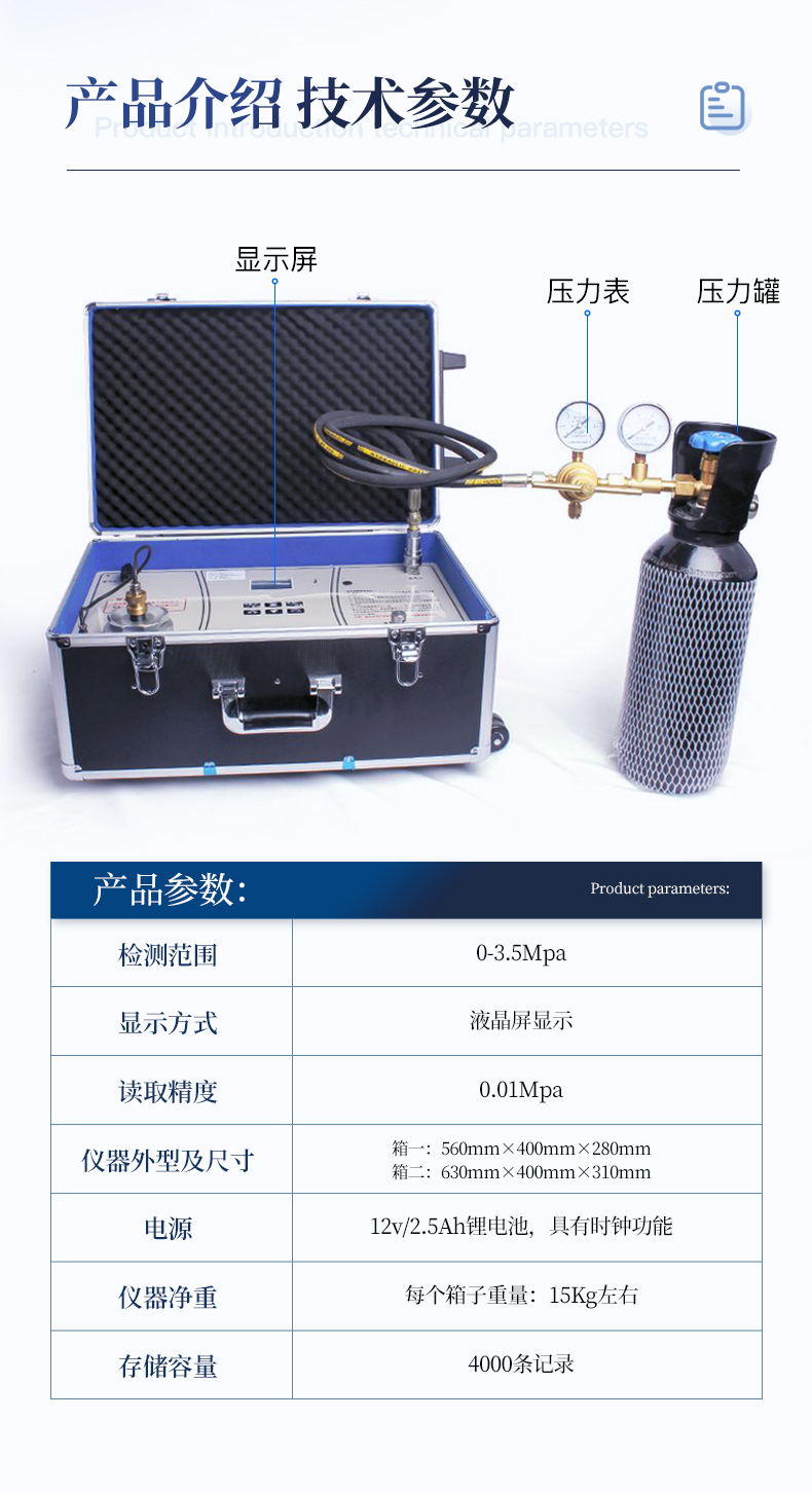 | 檢測范圍:0-3.5Mpa 2、顯示方式:液晶屏顯示 | 讀取精度:0.01Mpa | 儀器外型及尺寸:箱一:560mm×400mm×280mm 箱二:630mm×400mm×310mm | 電源:12v/2.5Ah鋰電池,具有時鐘功能 |